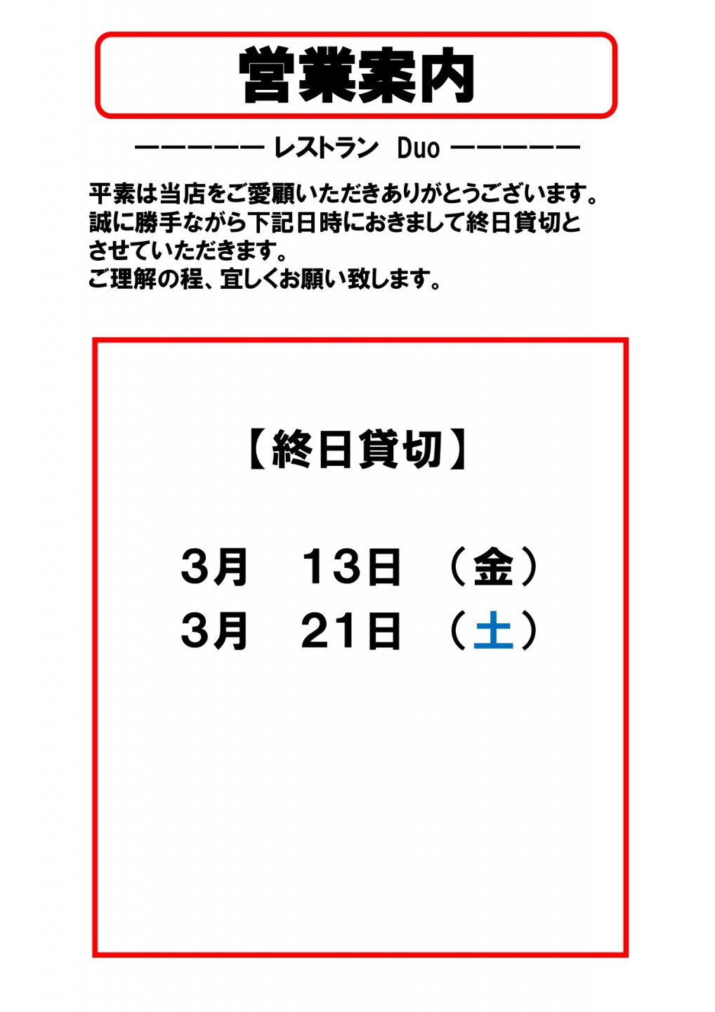 3月の営業案内